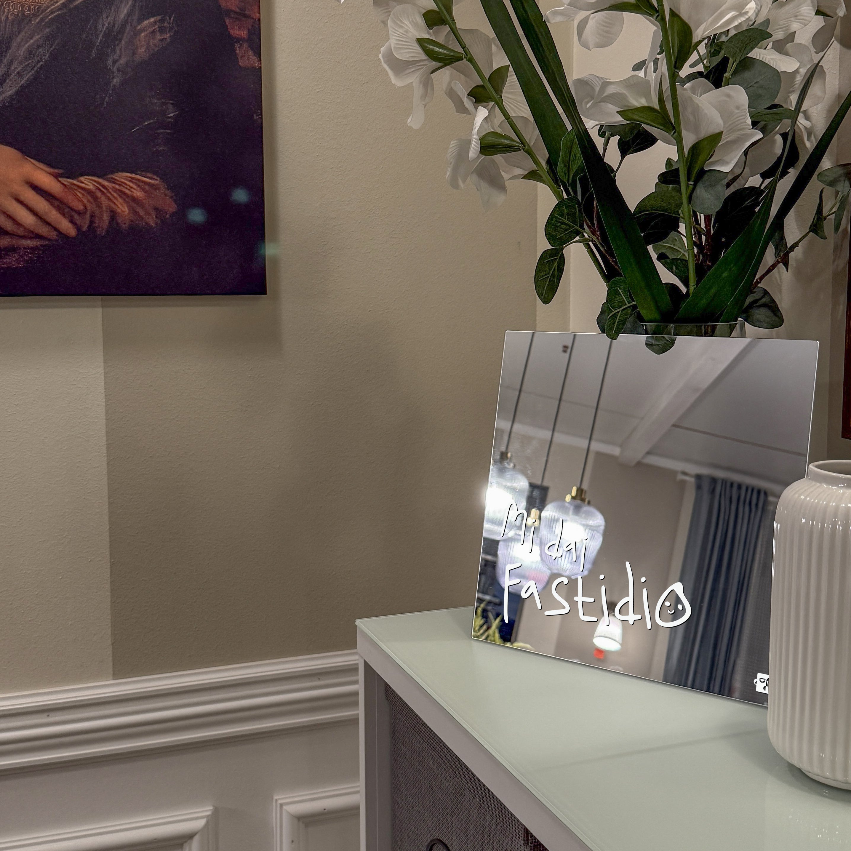 Questo specchio quadrato da 30×30 cm è la sintesi visiva del pensiero “mi dai fastidio”: vetro float con rivestimento argentato e pittura bianca serigrafata per un effetto forte ma elegante. Ottima riflettività oltre il 90 % e top di gamma nei materiali, perfetto per bagni, ingressi o uffici creativi. Lo spessore del vetro è pensato per durare senza deformazioni, trasformando un semplice riflesso in una dichiarazione di stile (a volte pungente).